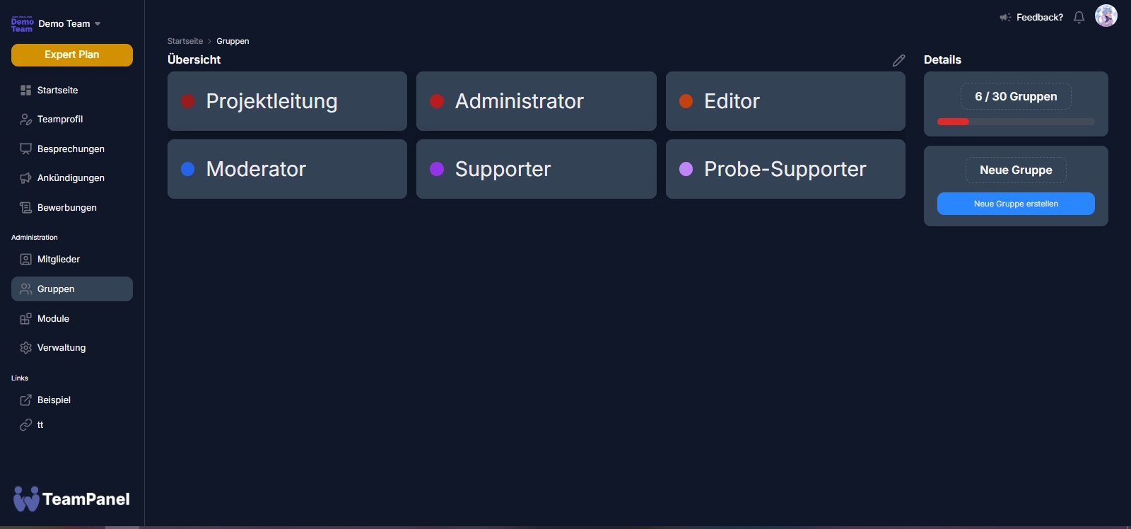 Groups in the TeamPanel can be, for example, ranks or departments in your project team. Here you can also define which group should have which permissions.