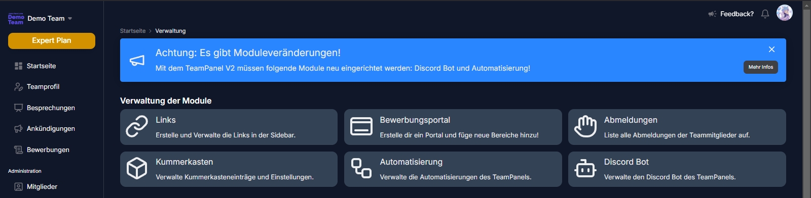 In the administration area you can manage modules, set a new team name or team profile picture. You can also set the requirements for team members to join your team.