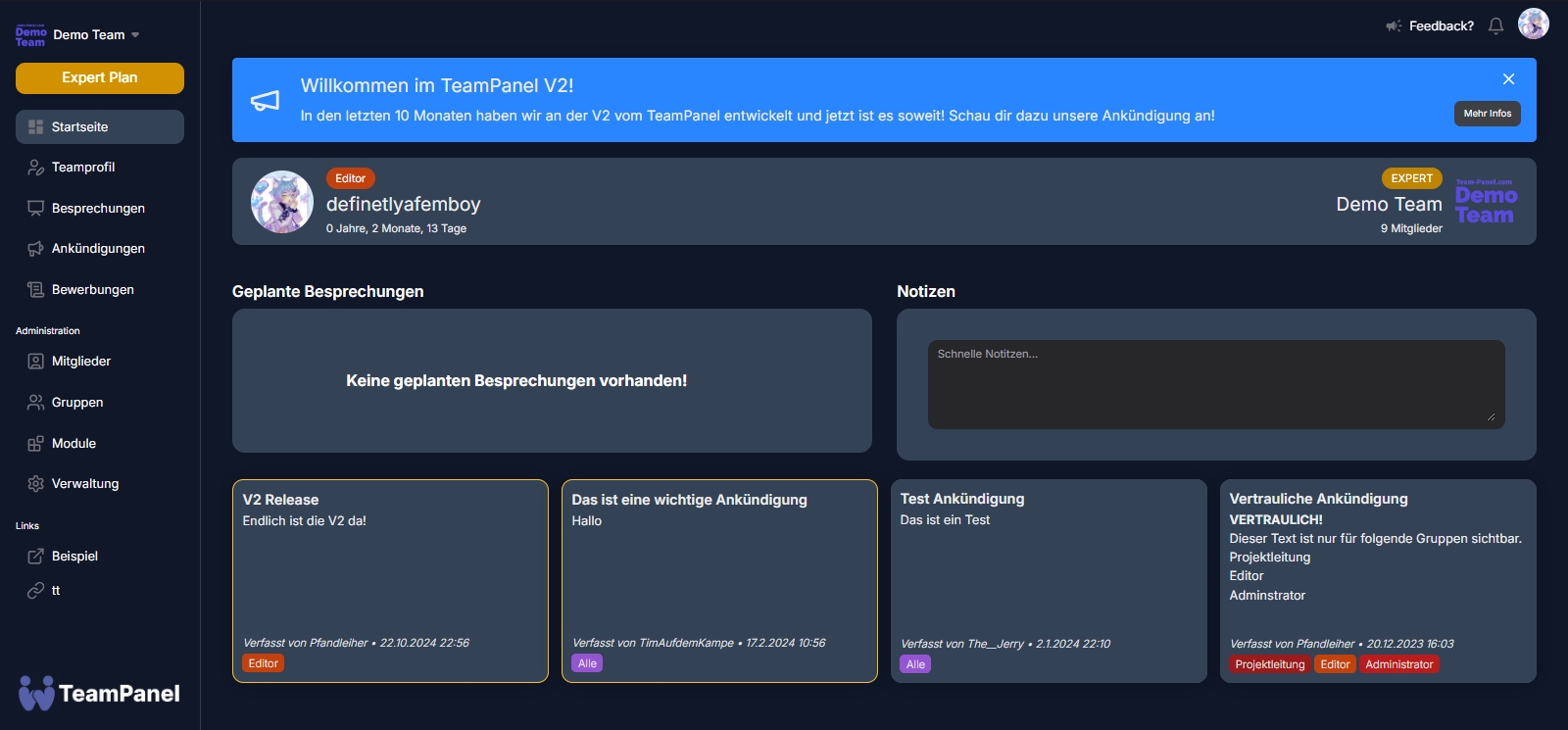 On the TeamPanel dashboard, you'll find various important content, such as your rank, your team's plan, how long you've been on the team, the current number of team members, scheduled meetings, and personal notes.