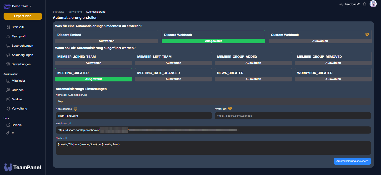 The automation is used to inform team members about changes in the TeamPanel, such as meetings, announcements, etc. Via a Discord webhook, in a specific text channel, so that none of your team members misses it because they haven't looked at the TeamPanel.