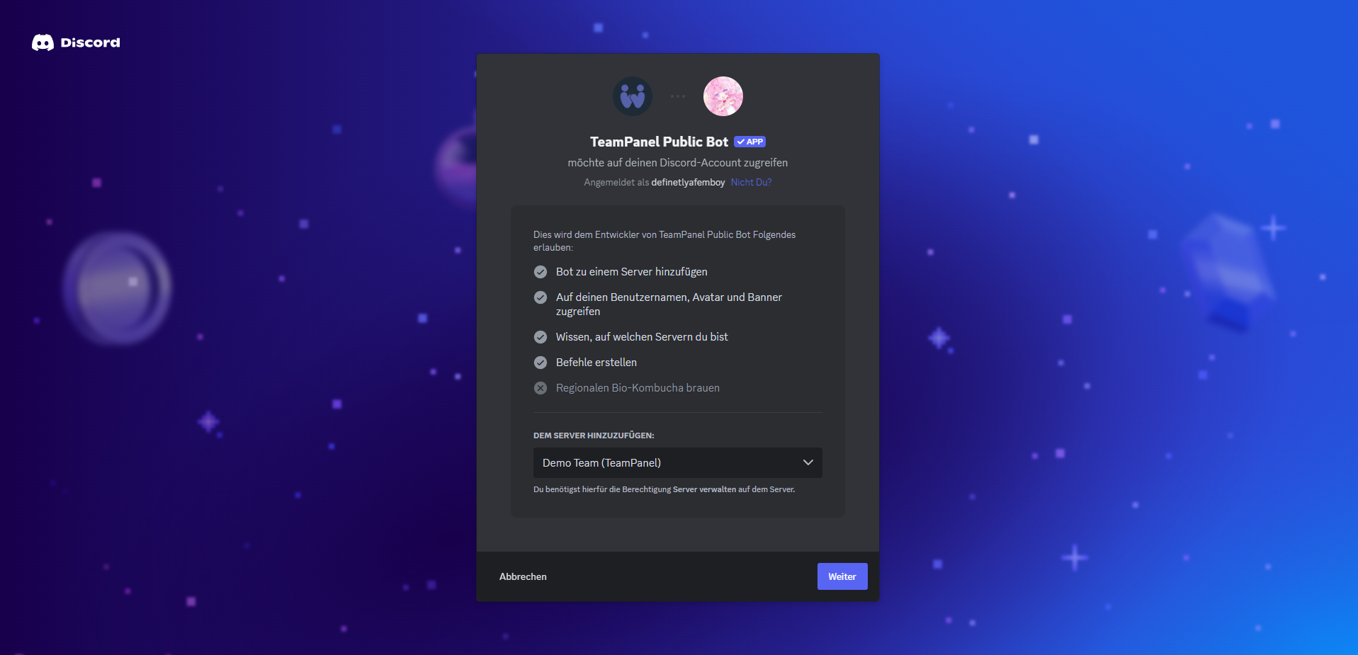 After that, you will be redirected to the Discord authorisation page, where you can read everything and then confirm by clicking ‘Next’.