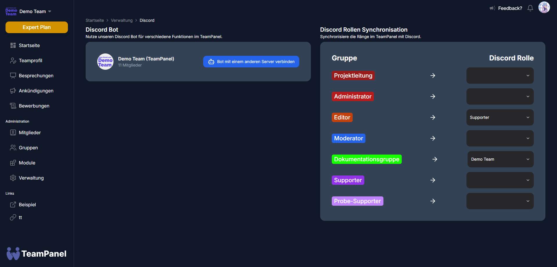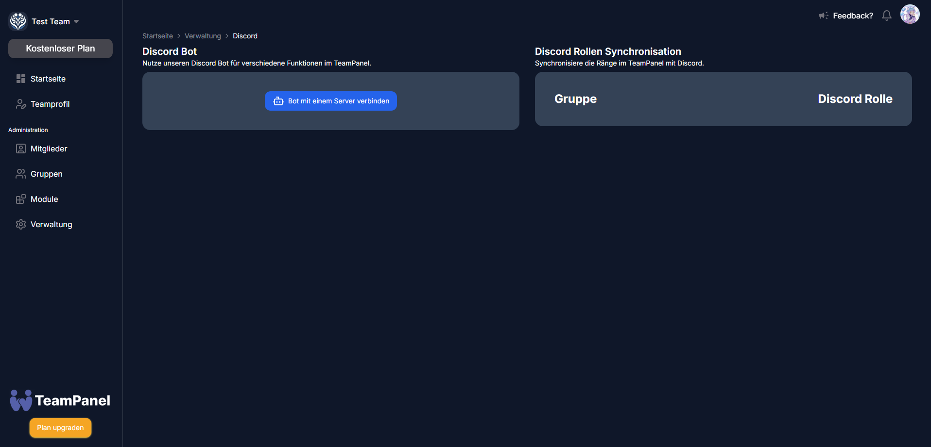 Once that's done, the data about the Discord should be displayed in the team panel (Discord name, Discord members and the roles of the Discord).