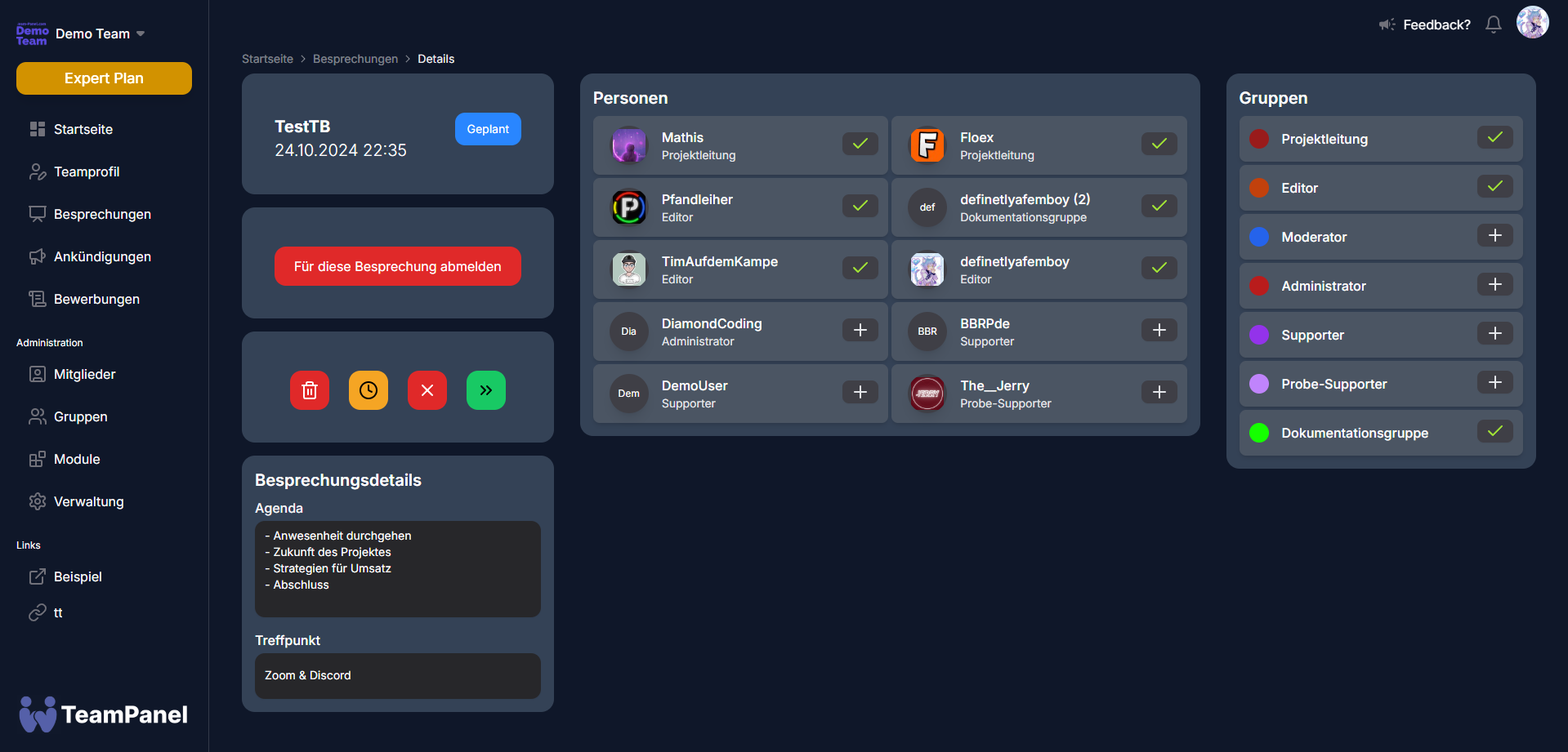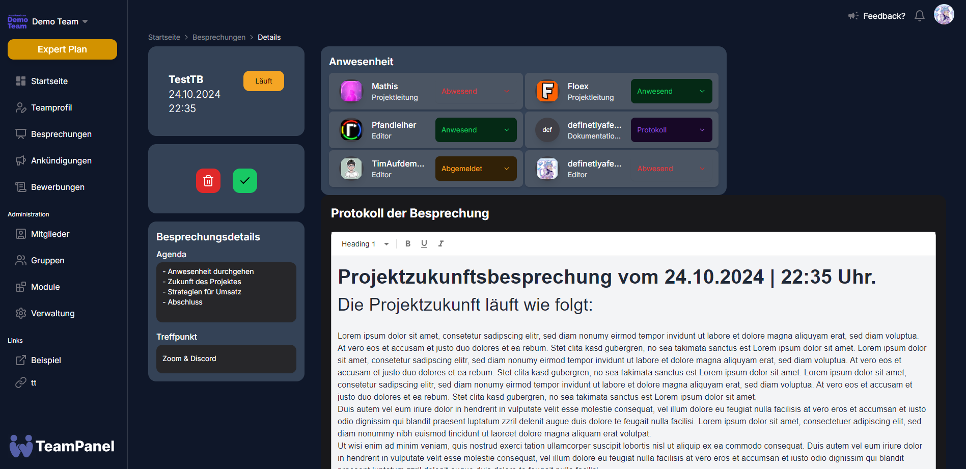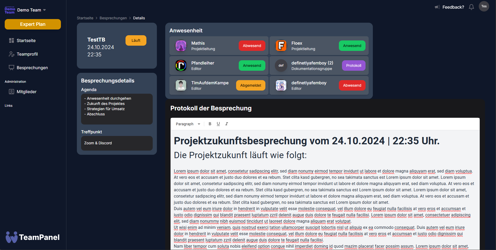The TeamPanel meeting module provides you and your team members with a convenient way to organise and manage meetings, including attendance, selecting a status, planning the agenda directly before the meeting and recording the minutes during the meeting or after the meeting (if the meeting has not yet been set to ‘completed’).
