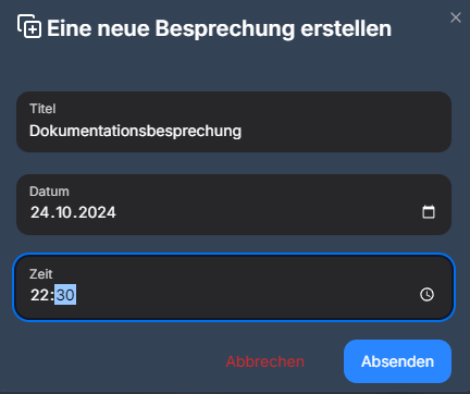 A new meeting can be easily created by an authorised person under ‘Meetings’ by clicking on the ‘+’ symbol and then entering the title of the meeting, the date and the time. After that, you can click on ‘Send’ and the meeting is created.