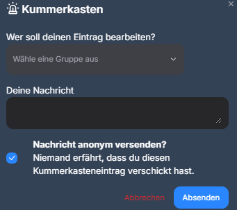 The worry box offers you the opportunity to easily report internal team conflicts, concerns or other topics, anonymously or with your name. To do so, go to your team profile and click on the ‘+’ next to your worry box. Then select a group that should deal with the concern, and write your concern in it. Finally, select whether you want your message to be sent anonymously. Then click on ‘Submit’ and your worry message has been created.