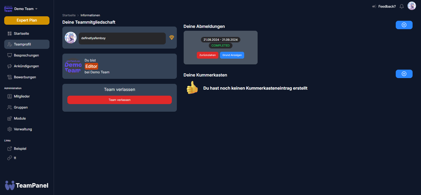 On the team profile, you can view and edit various data about your team, change your username on the team (if your team has the Starter plan or higher), sign off meetings, use the worry box, view your rank, and leave the team (if you are not the team owner).